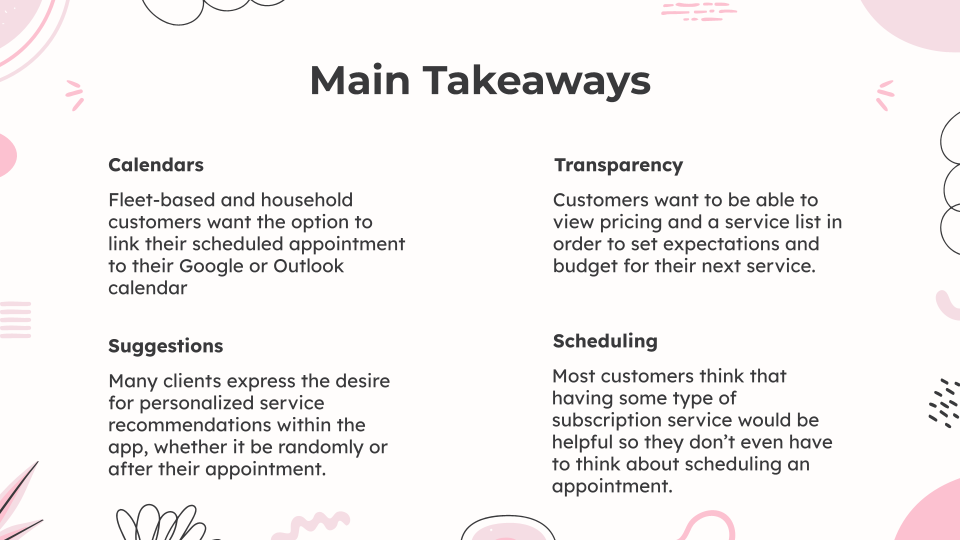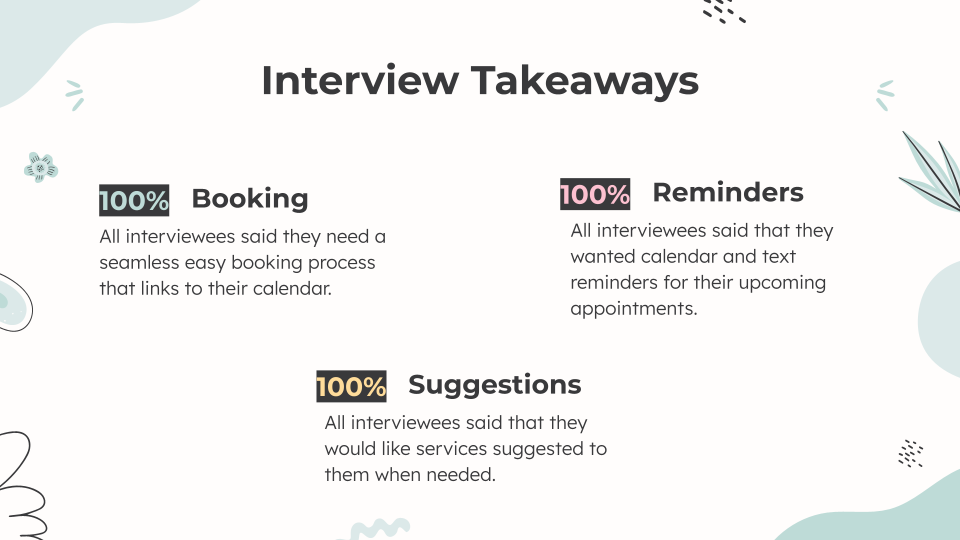 My interviews revealed that my clients’ current customers were struggling with remembering to even book the appointment, and would highly value features such as reminders, appointment suggestions, and appointments that link to their mobile calendar.