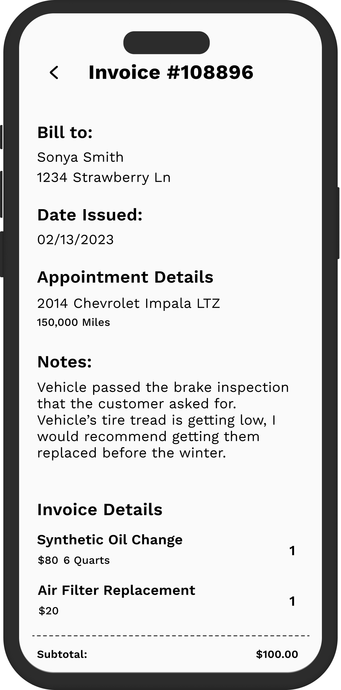Detailed invoices allow users to glance over appointment details and suggestions for future maintenance