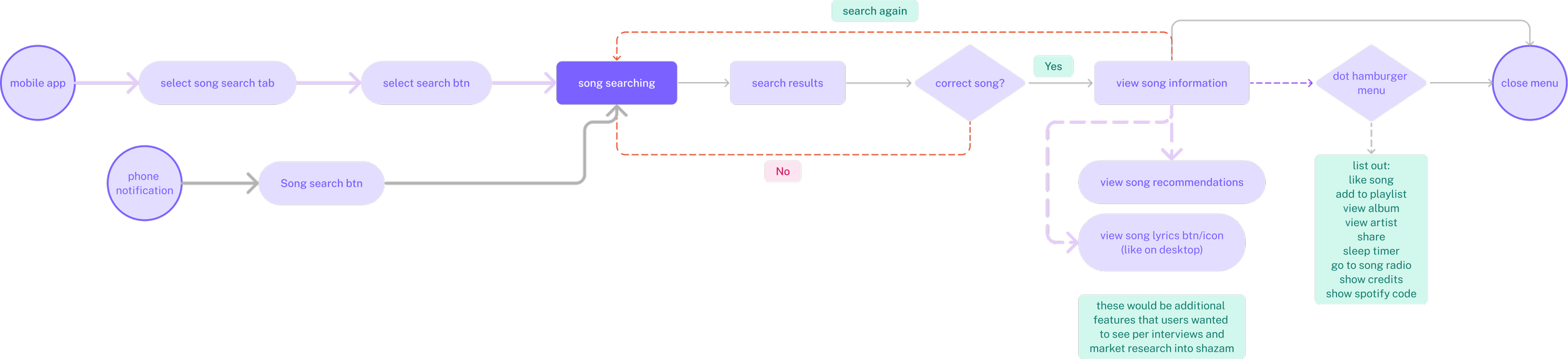 Using the information I gathered during interviews, I created a user flow that incorporated the new song search feature into the existing app. Throughout this process, I prioritized the compatibility of the new addition with Spotify's existing features to create a harmonious addition. This involved thoroughly examining how the new feature would align with the app's overall layout and how existing functionalities would carry over.