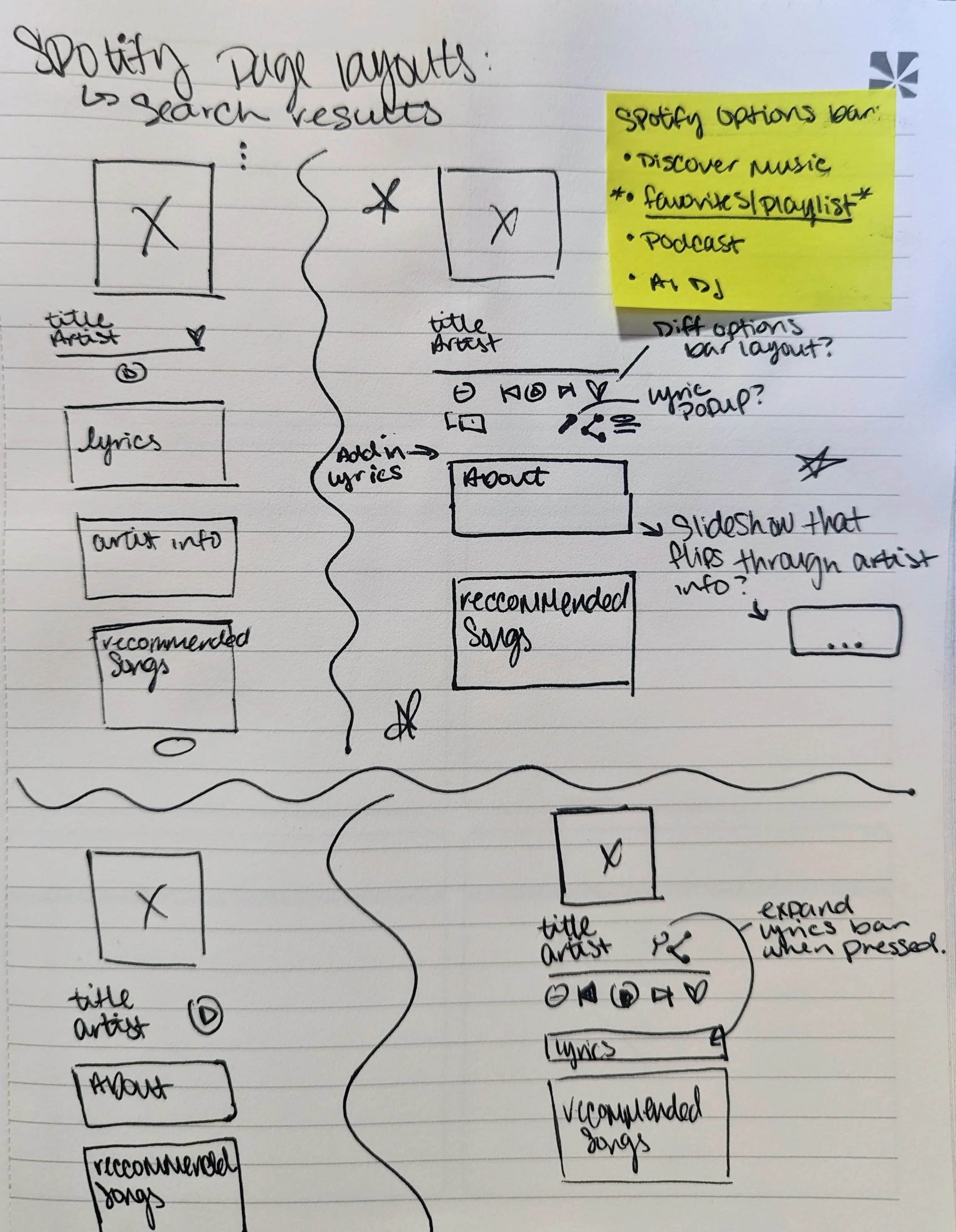 I sketched potential layouts for the results page on Spotify, taking into account its varying layouts based on user activity. After careful consideration, I opted for the results page designed for when the user is listening to their favorite songs, as it was the most intuitive selection. However, I also incorporated a "recommended songs" section at the bottom of the page to align with the insights gathered from my interviews.